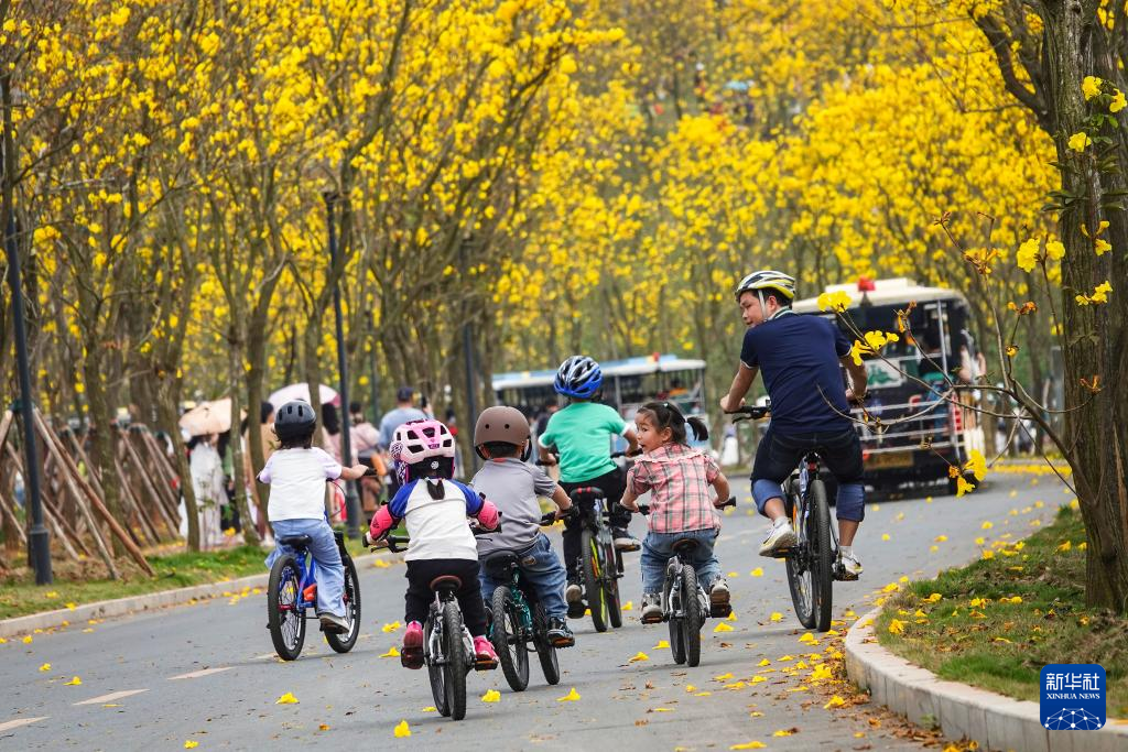 3月23日,在广西南宁市青秀山景区风铃谷,游人骑自行车在黄花风铃木花海长廊畅游。