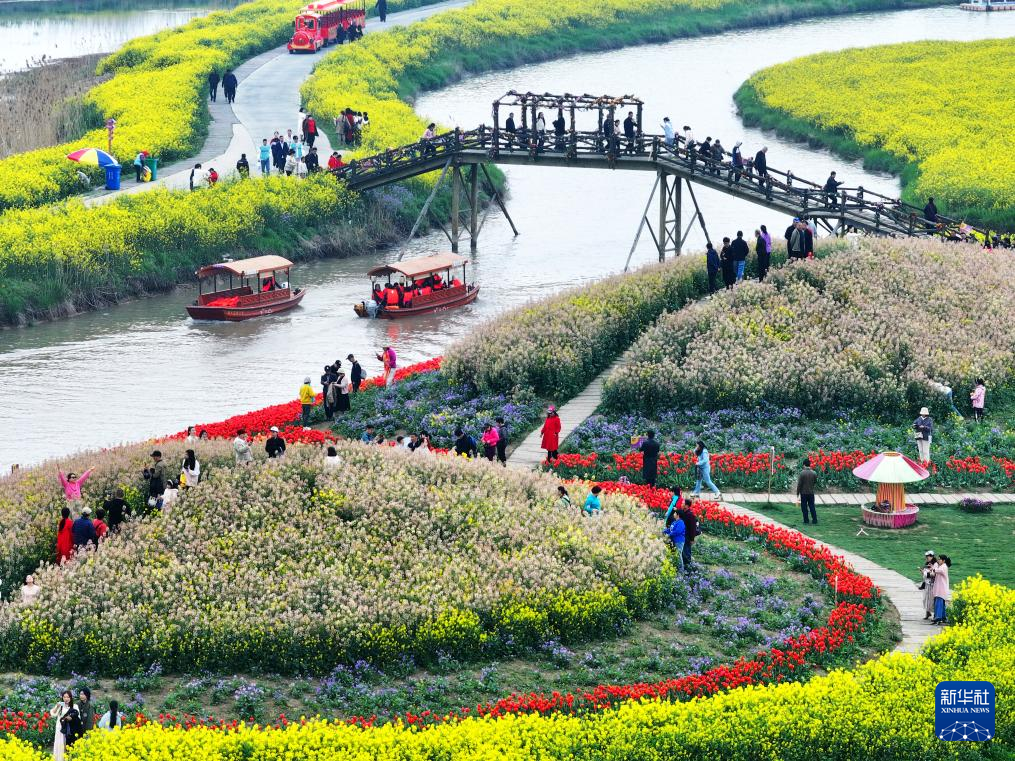 4月6日,游客在江苏省扬州市高邮湖上花海景区赏花游玩(无人机照片)。