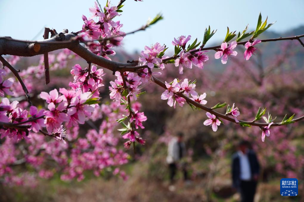 近日,山东省潍坊市临朐县嵩山山区,果农种植的4万余亩桃树陆续开花,为山坡“染上”桃红色,吸引不少游客前来赏花游览。