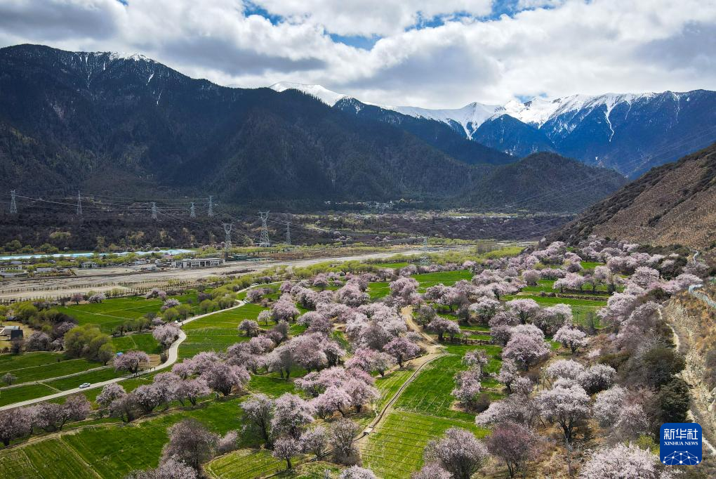 林芝市巴宜区朵当村盛开的桃花(3月30日摄,无人机照片)。