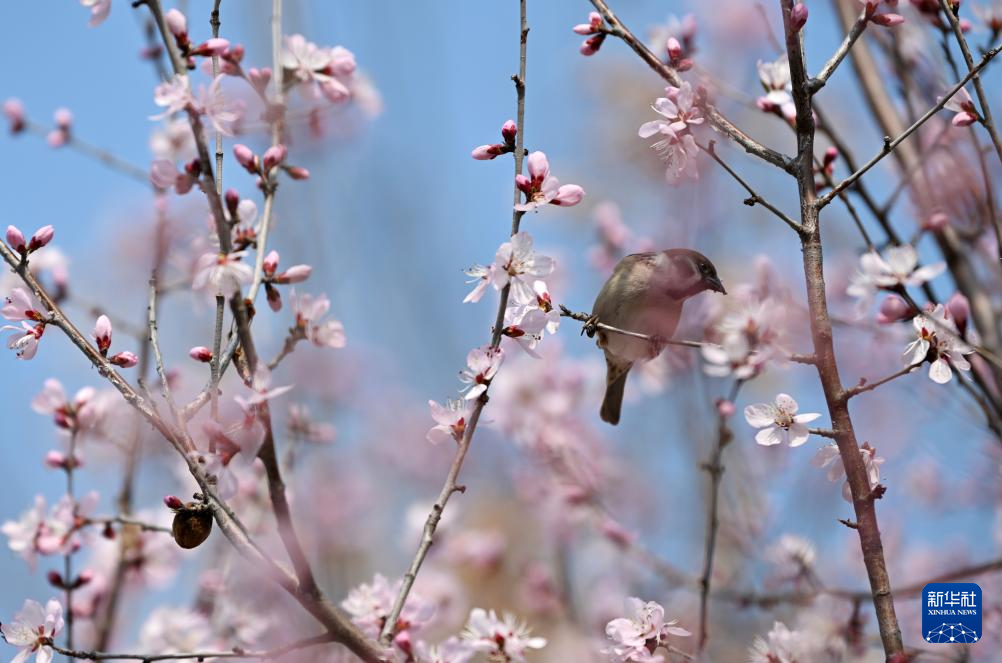 3月15日,一只小鸟在天津桃花堤的桃树枝上休憩。