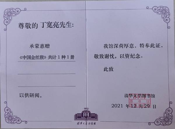 清华大学图书馆为丁宽亮颁发的捐赠证书(受访人供图)