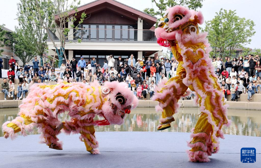 5月1日,游客在浙江省湖州市德清县新市古镇观看舞狮表演。