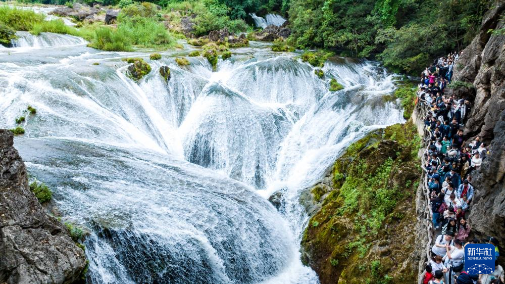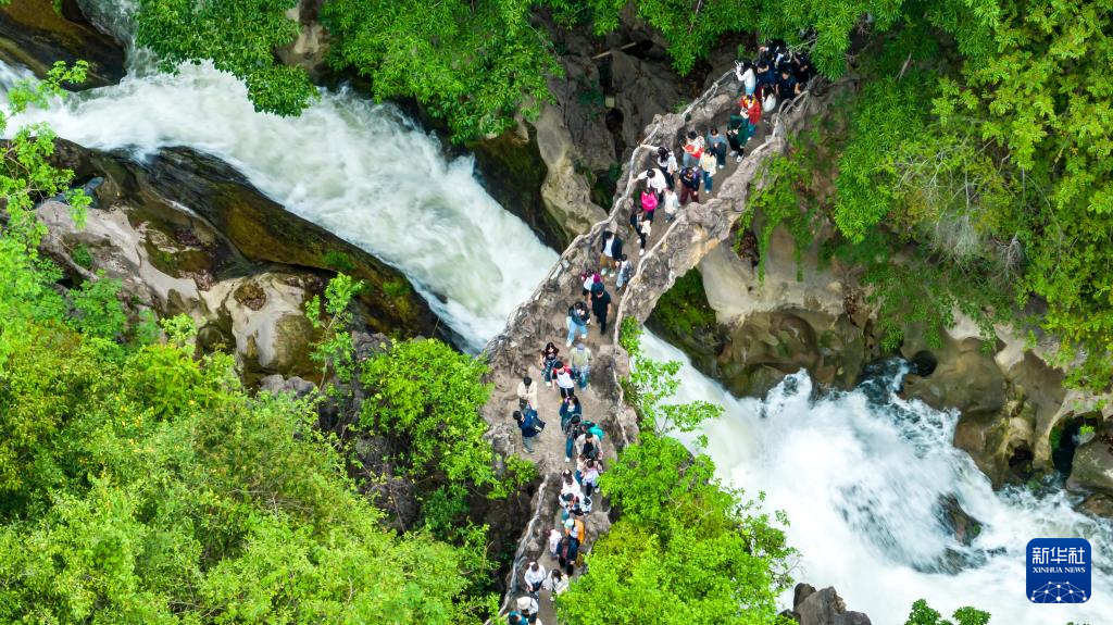 5月2日,游客在贵州省安顺市天星桥景区游览银链坠潭瀑布(无人机照片)。
