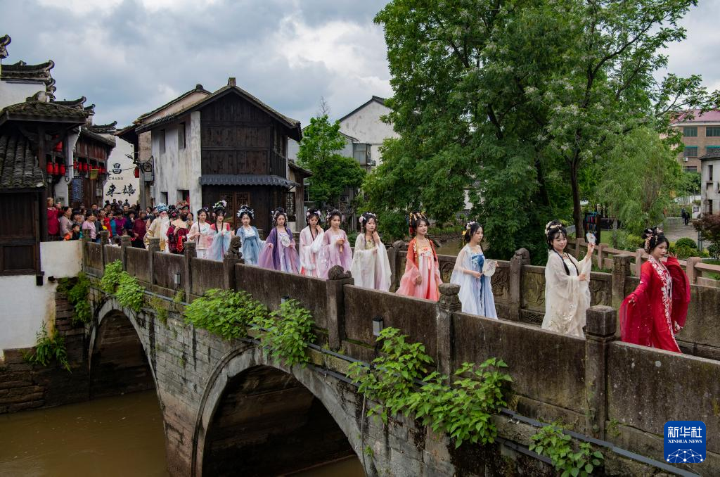5月1日,浙江省兰溪市永昌街道李渔风情街,汉服巡游队伍经过古桥。