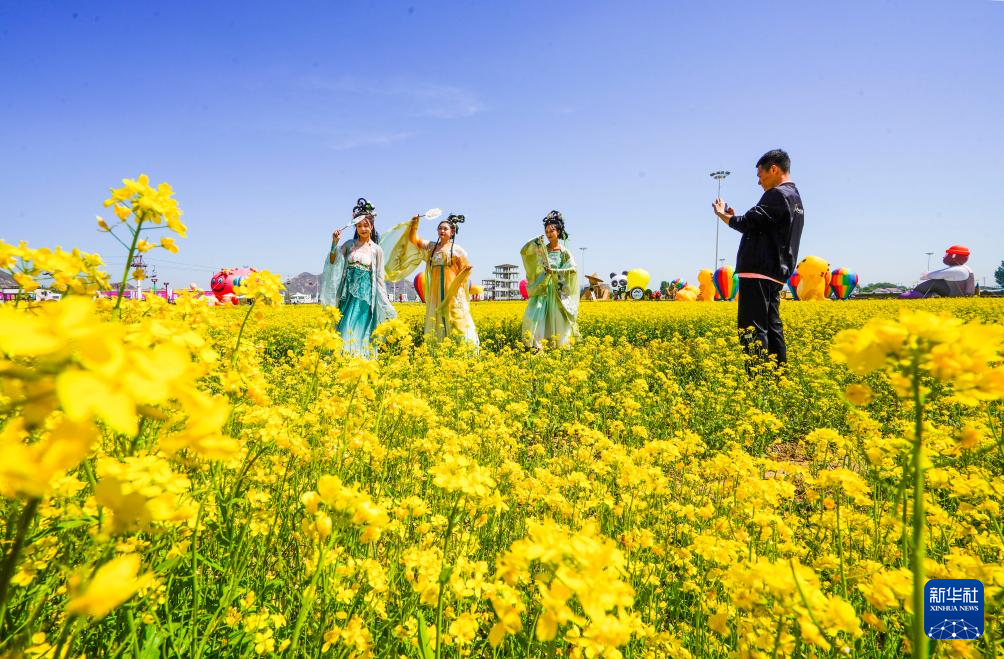 5月1日,游客身穿汉服在河北省遵化市一花海景区拍照。