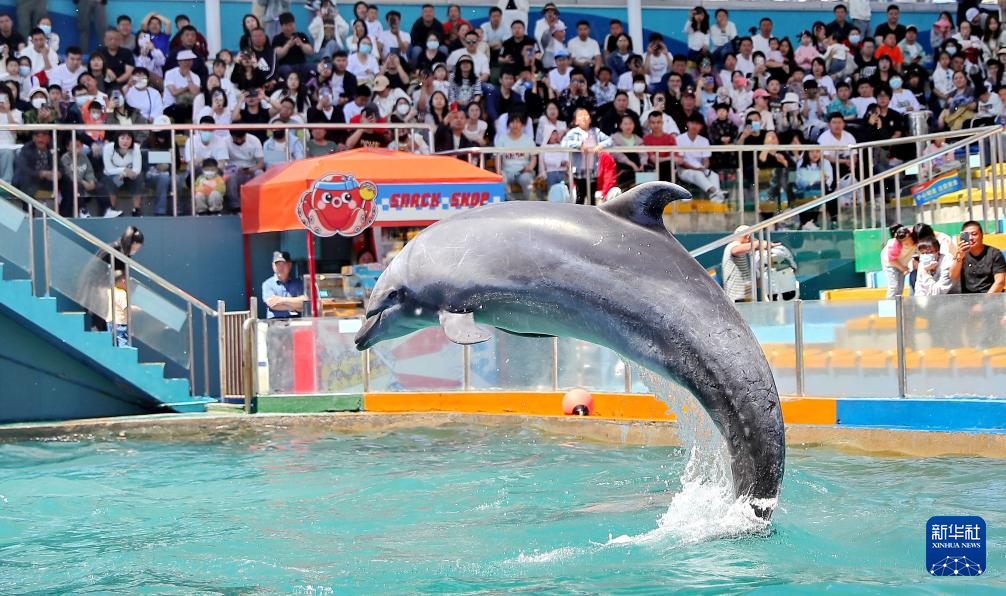 5月1日,游客在河北省秦皇岛市海港区新澳海豚表演馆观看海豚表演。