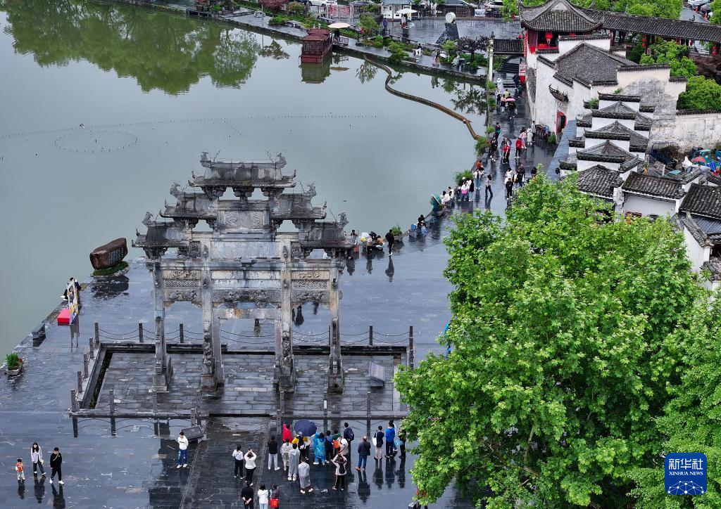 5月4日,游客在安徽省黄山市黟县西递古村游玩赏景(无人机照片)。