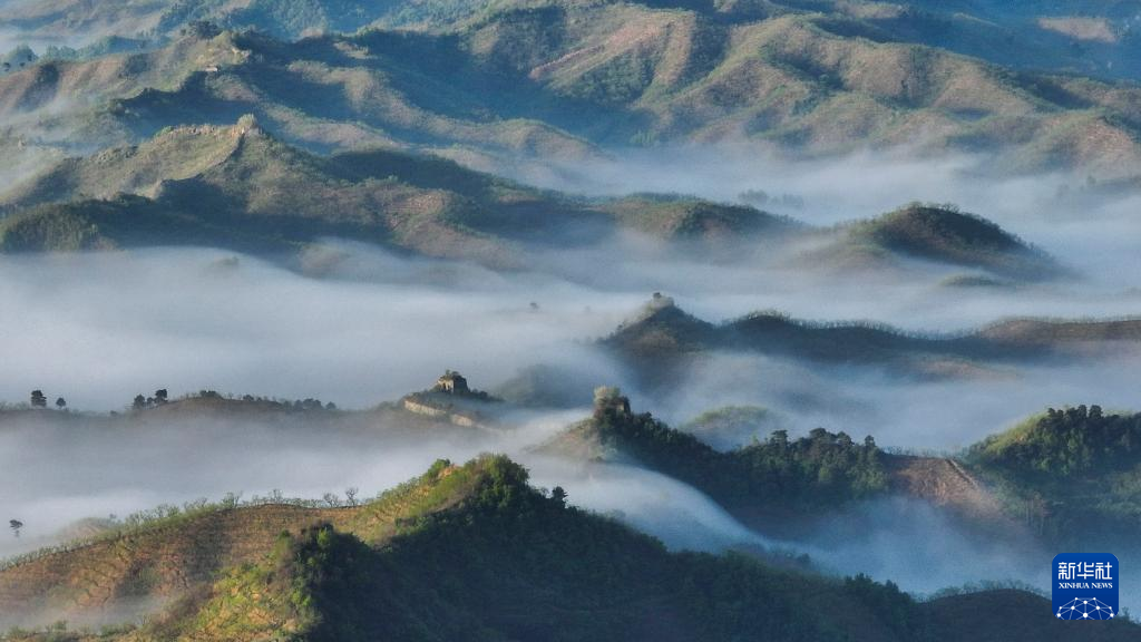 4月30日在河北省遵化市小厂乡拍摄的洪山口长城晨景(无人机照片)。