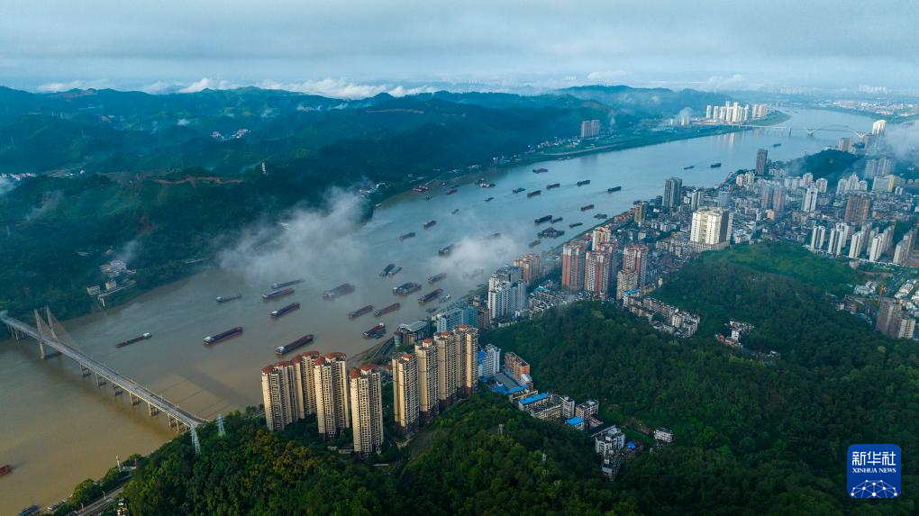 5月5日,在西江航运干线广西梧州市区段,往来船舶如梭(无人机照片)。