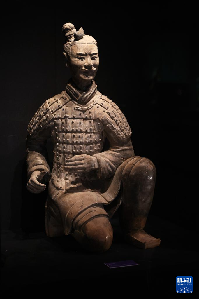 这是在陕西历史博物馆秦汉馆展出的秦跪射俑(4月15日摄)。陕西历史博物馆秦汉馆“秦汉文明”系列展览展出包括汉代古船“丝路一号”、杜虎符、鎏金铜蚕在内的约1500件文物。