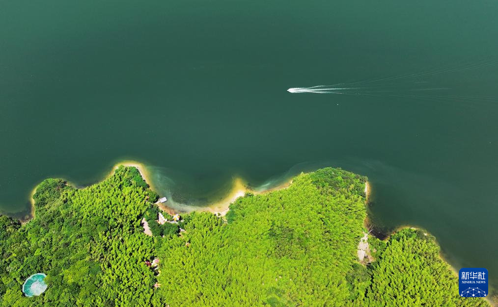 5月14日,游船在江苏省溧阳市天目湖景区内行驶(无人机照片)。