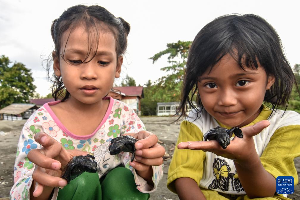 6月5日,在印度尼西亚中苏拉威西省栋加拉的一处海滩,孩子们准备将海龟放归大海。