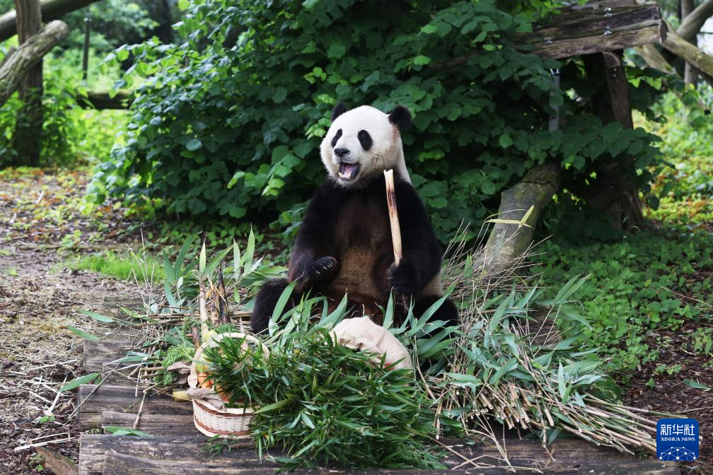 6月2日,在比利时布吕热莱特的天堂动物园,大熊猫“天宝”在享用“生日大餐”。