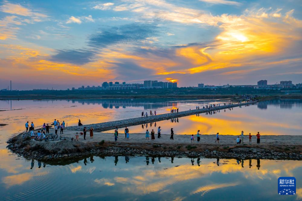 6月10日,游客在山西运城盐湖游览(无人机照片)。