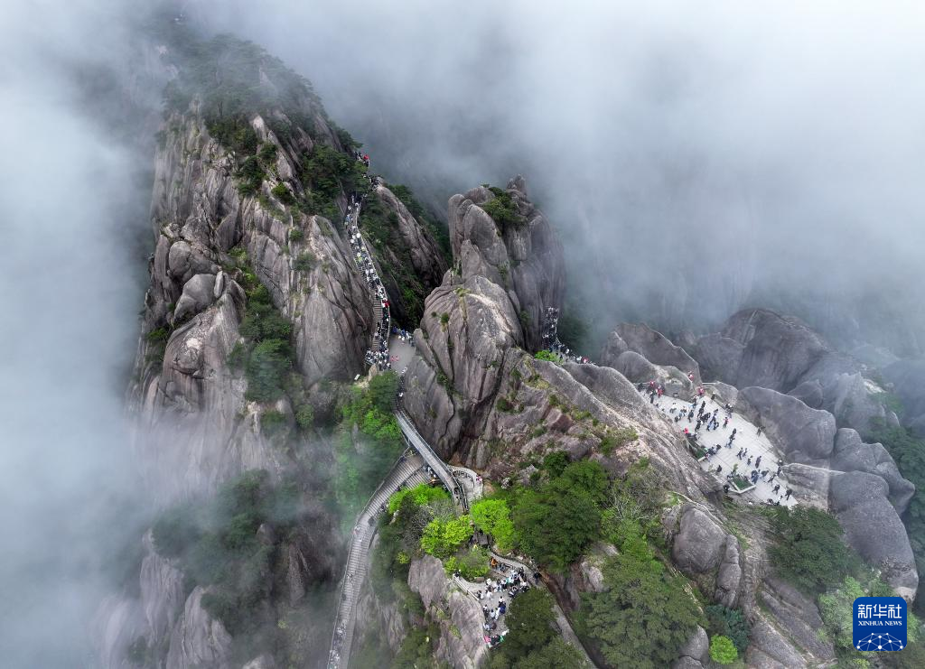 5月1日,游客在位于安徽省黄山市的黄山风景区游玩(无人机照片)。