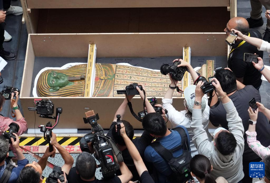 6月17日,在上海博物馆人民广场馆,萨卡拉考古遗址的彩绘人形棺开箱亮相。