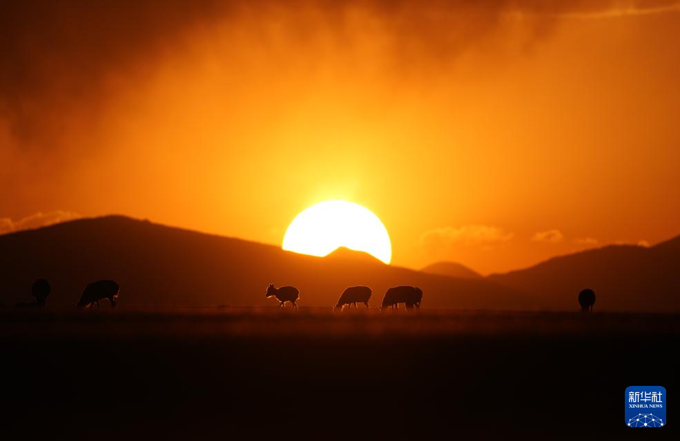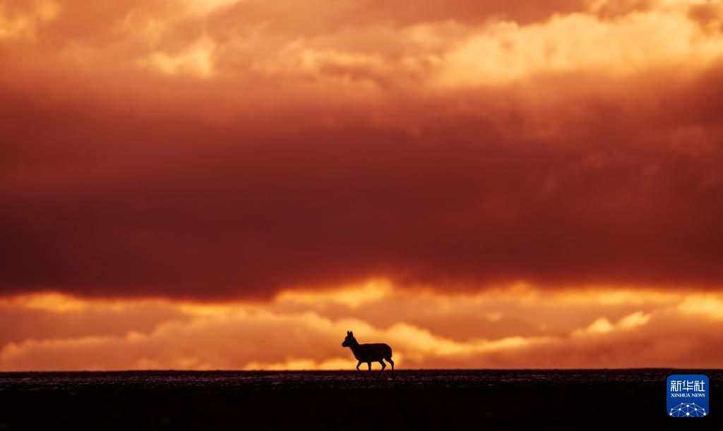 西藏那曲市申扎县买巴乡鲁确塘草原上,夕阳下的母藏羚羊(6月16日摄)。