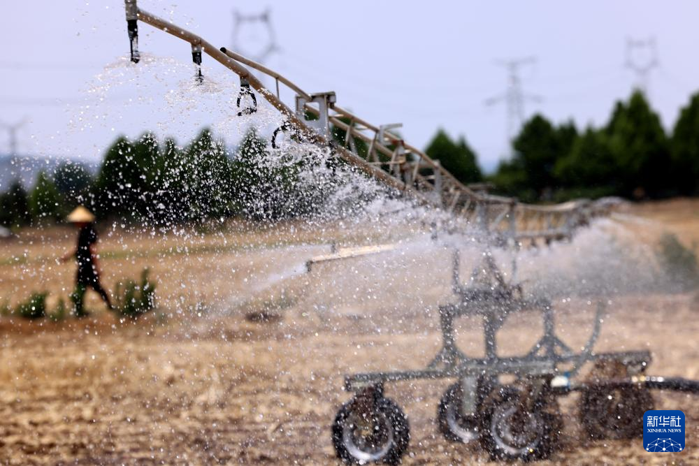 6月18日,山东省枣庄市西王庄镇东王庄村农民利用智能喷灌机浇水造墒。