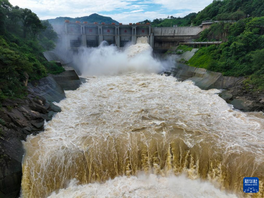 6月20日,湖南省郴州市桂阳县欧阳海水库开闸泄洪(无人机照片)。