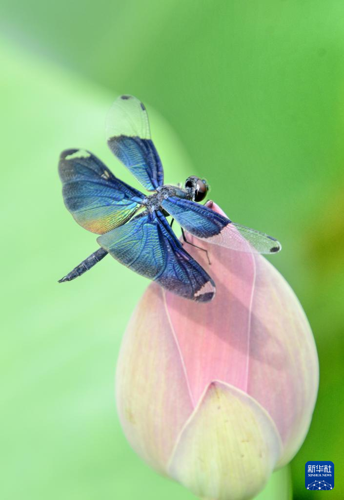 6月30日,在圆明园遗址公园,一只蜻蜓落在荷花花蕾上。