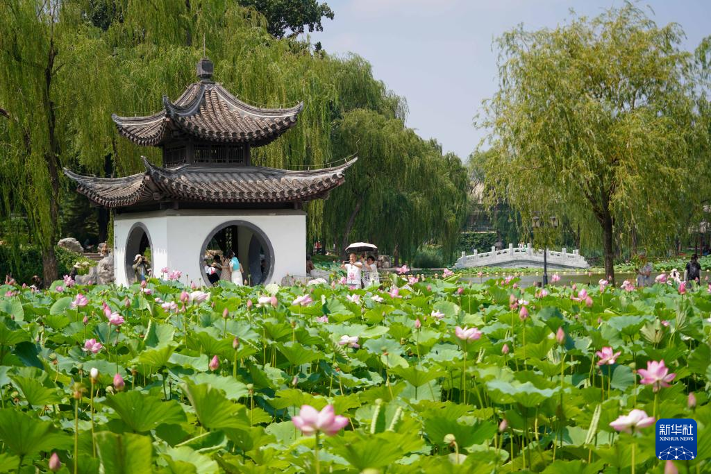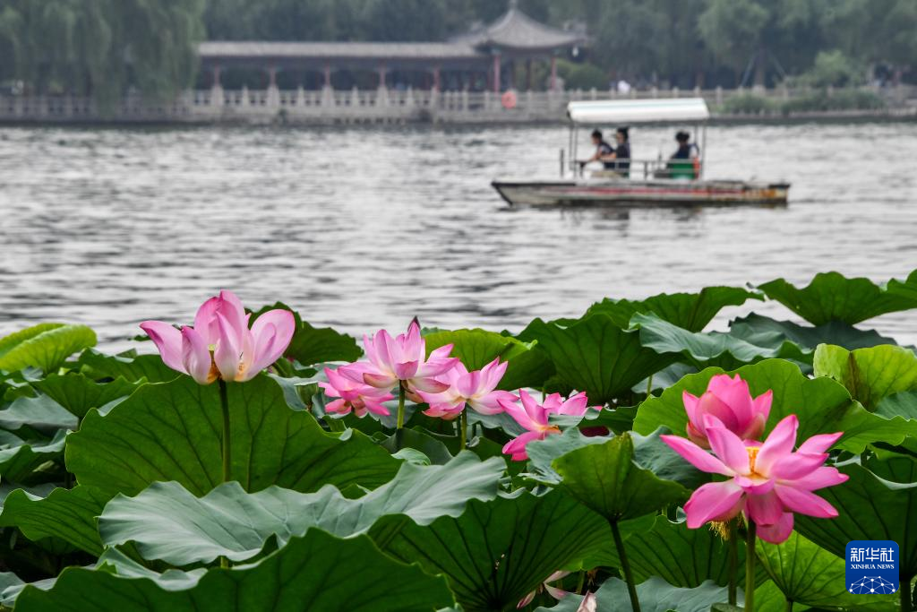 近日,山东省济南市大明湖荷花盛开,再现“四面荷花三面柳”的美景,吸引游客前来观赏。