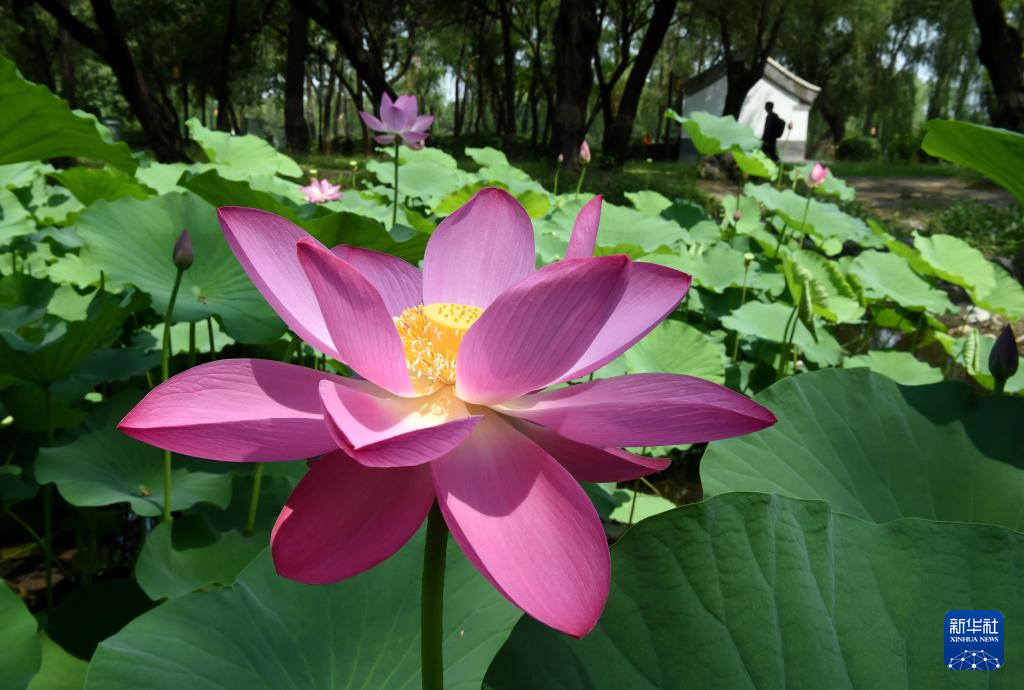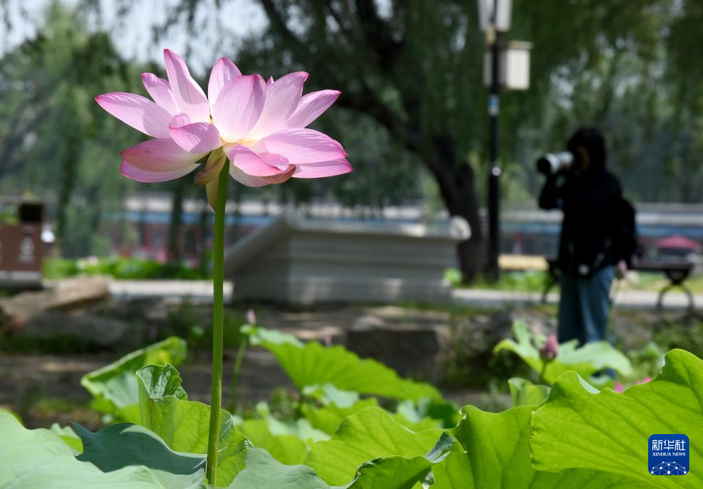 盛夏时节,北京市陶然亭公园的荷花竞相绽放,吸引众多市民赏花。