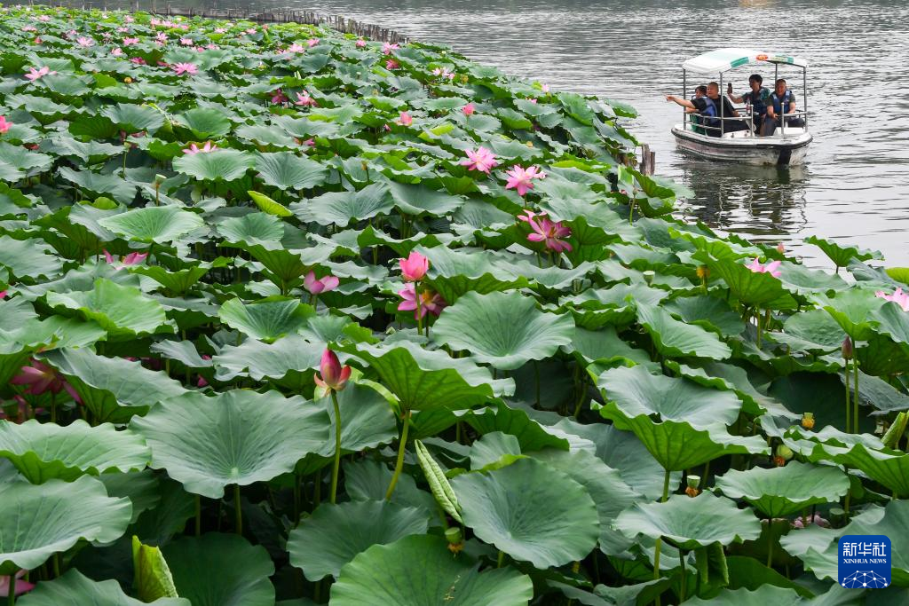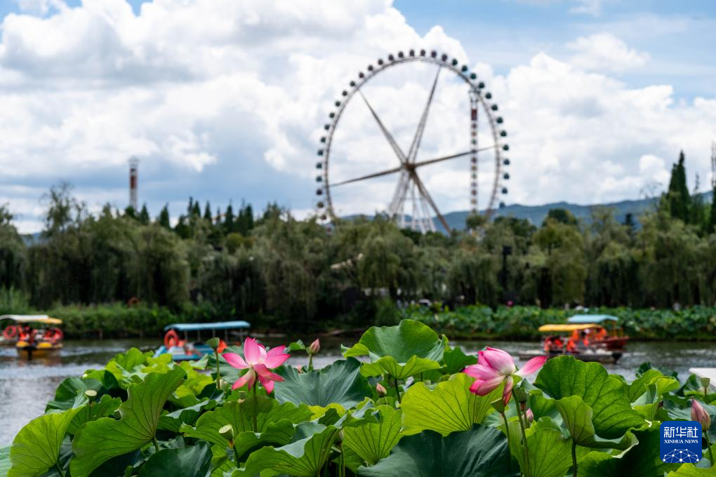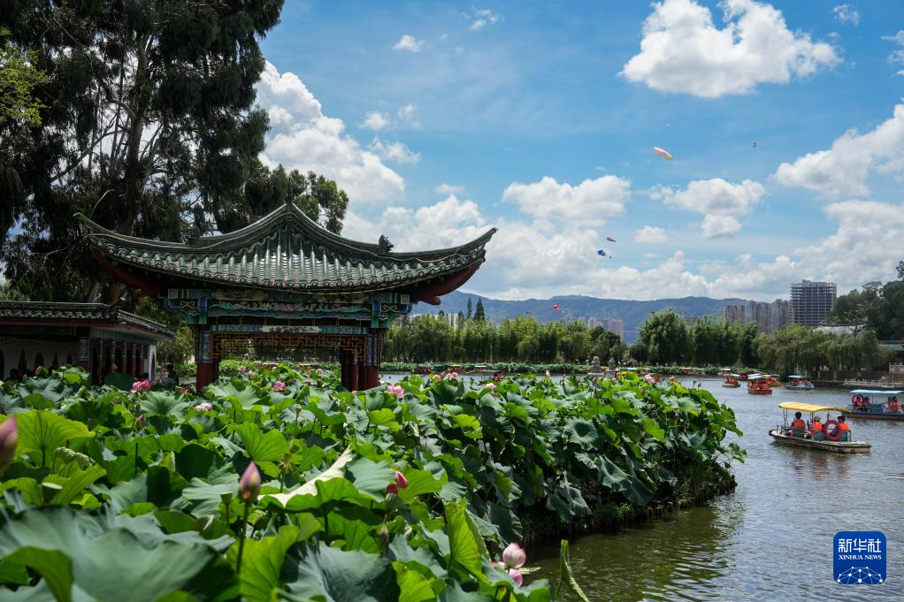 近日,云南省昆明市大观公园内的百亩荷花陆续盛开,吸引众多市民前来赏荷、拍照。