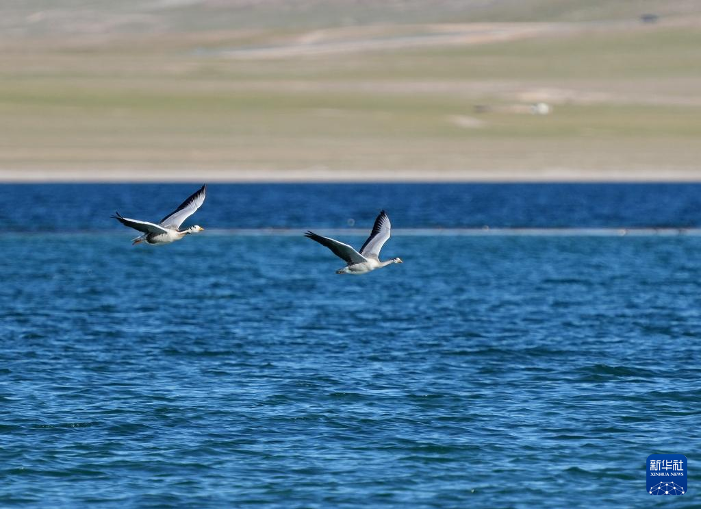 斑头雁在错鄂湖上飞翔(8月25日摄)。