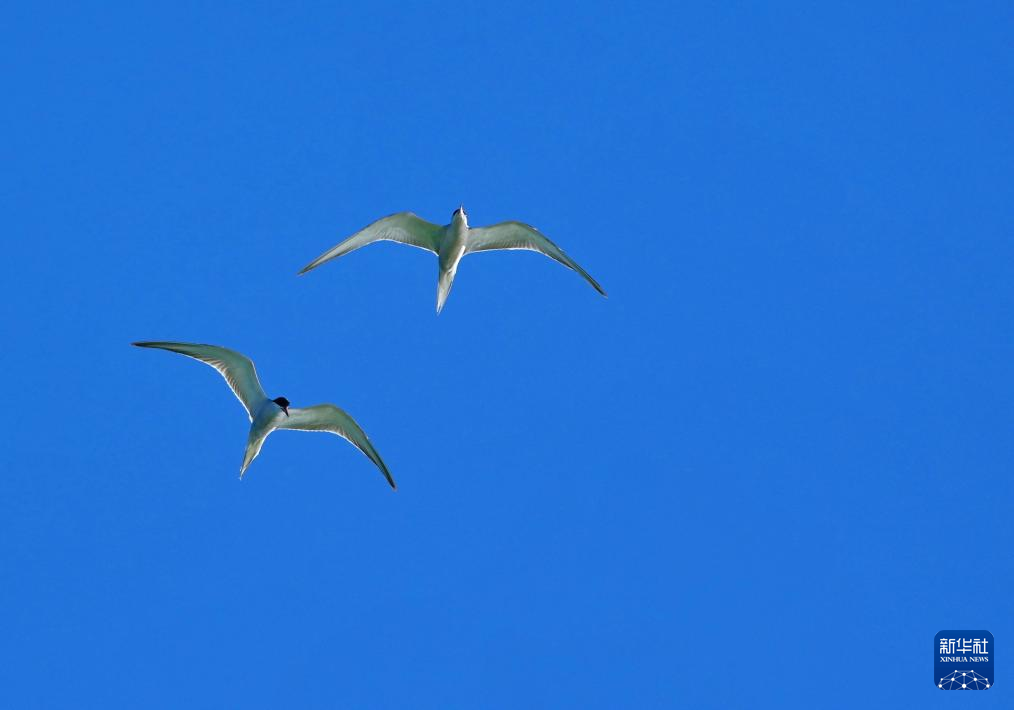 燕鸥在错鄂湖上空飞翔(8月25日摄)。