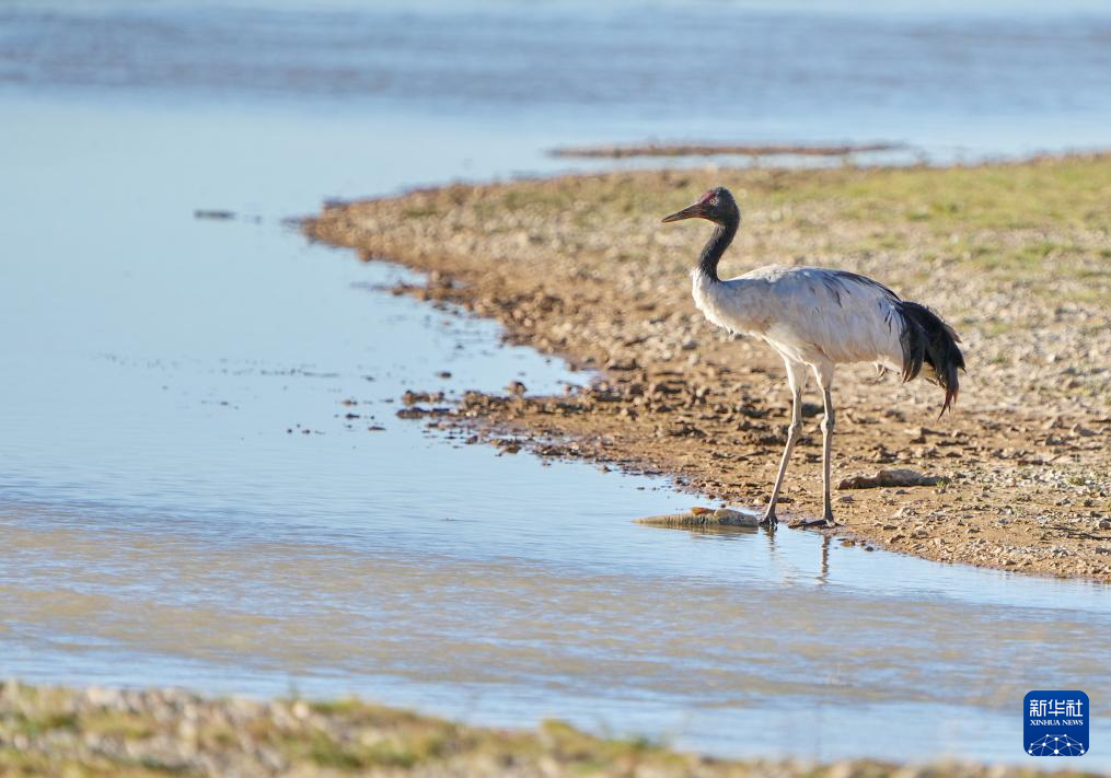 错鄂湖旁湿地里的黑颈鹤(8月25日摄)。