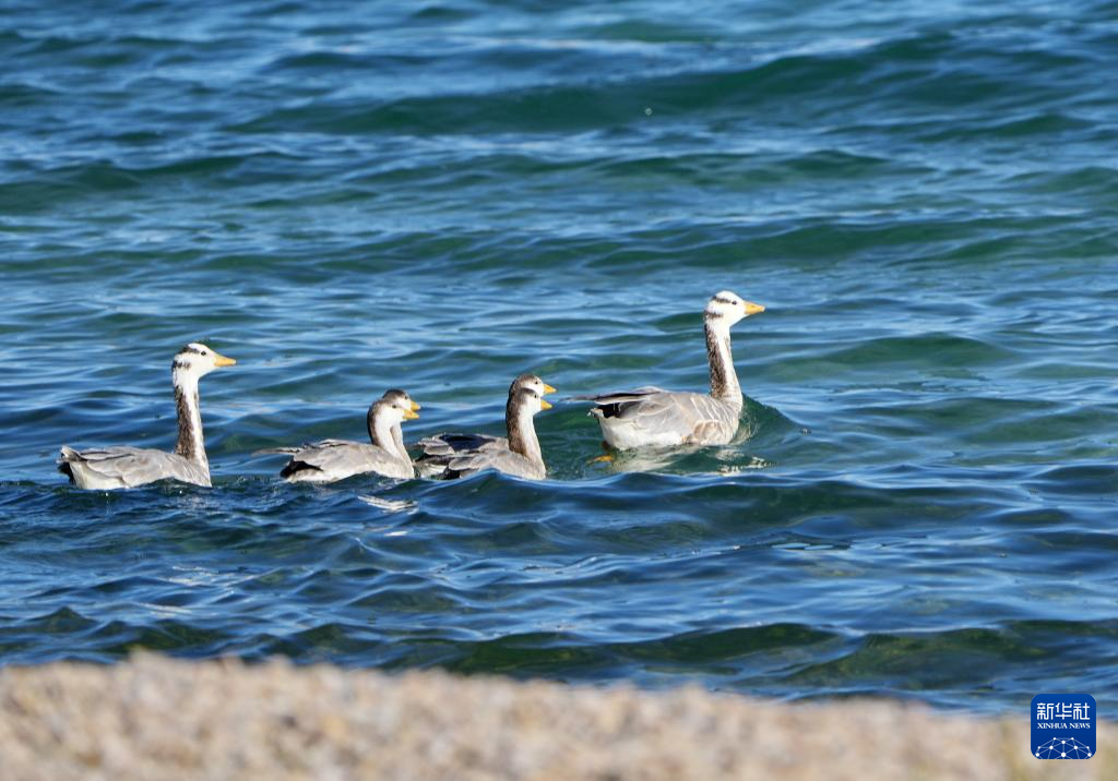 斑头雁在错鄂湖里游弋(8月25日摄)。