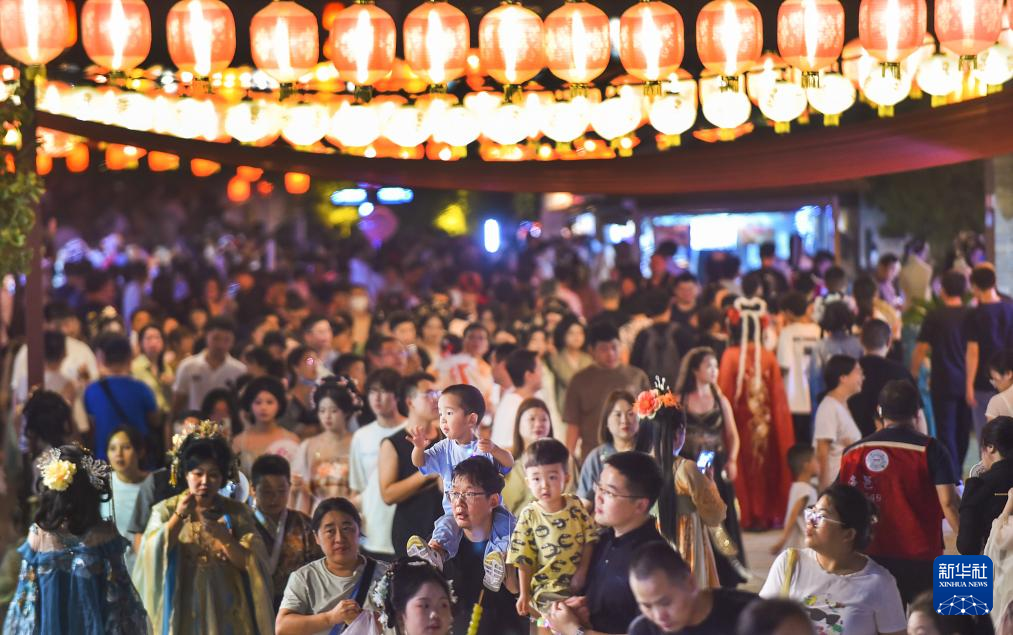 9月16日晚,游客在河南省洛阳市洛邑古城景区休闲游玩。