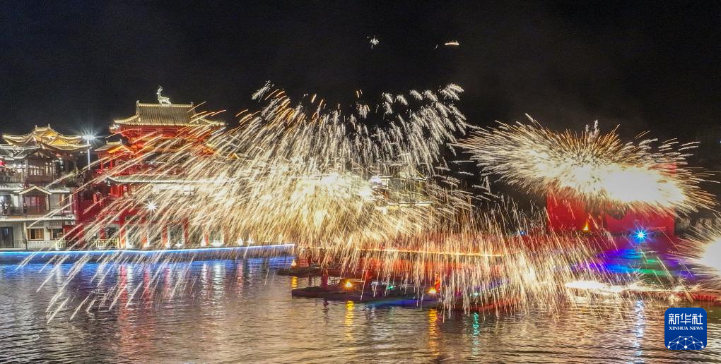 9月16日晚,民间艺人在河北省唐山市丰南区河头老街景区为游客表演打铁花(无人机照片)。