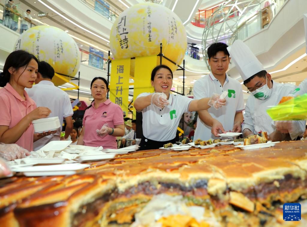 9月17日,在河南省南阳市中心城区吾悦广场,工作人员在切割“超级大月饼”分给游客。