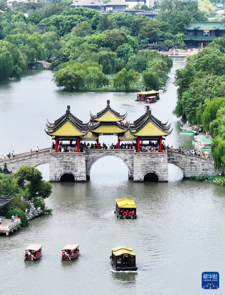 9月17日,游客在江苏扬州瘦西湖风景区游玩(无人机照片)。