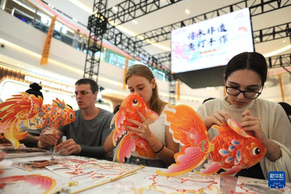 9月17日,几名留学生在山东烟台吾悦广场参加玲珑鱼灯制作活动。