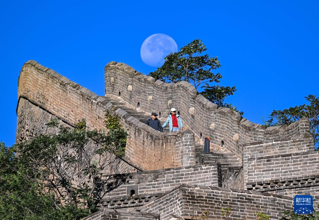 9月21日清晨,游客游览金山岭长城,月亮仍高高挂在长城上空。