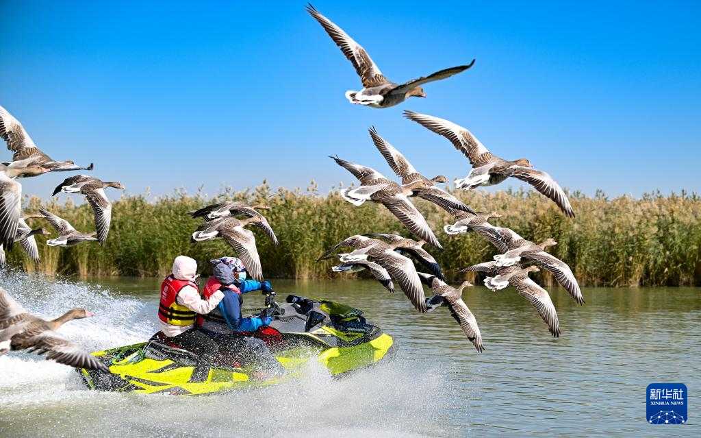 10月2日,游客在沙湖景区乘坐快艇时大雁在一旁飞翔。