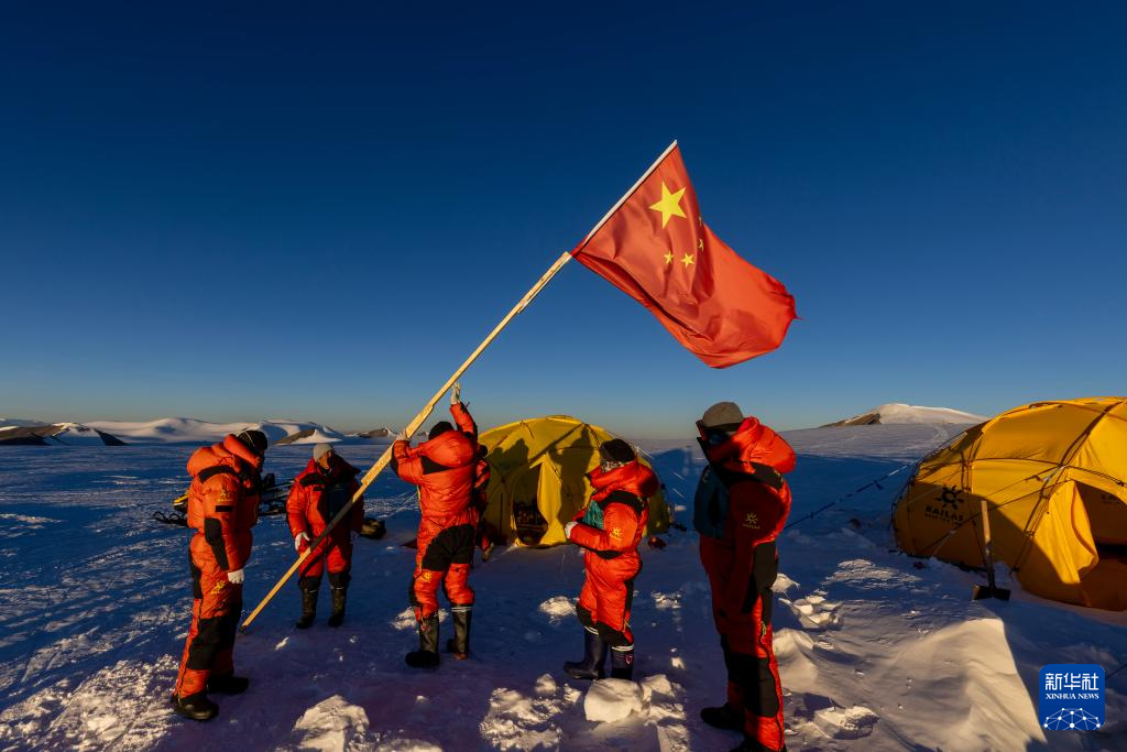 10月1日清晨,第二次青藏科考队普若岗日冰原冰芯钻取与冰面过程科考小组队员在营地安插国旗。