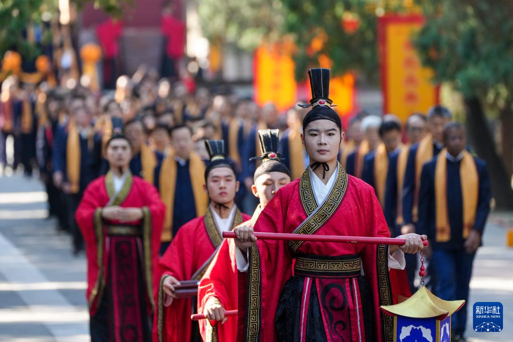 9月28日,在2024甲辰年公祭孔子大典上,演职人员引导参祭嘉宾步入曲阜孔庙。