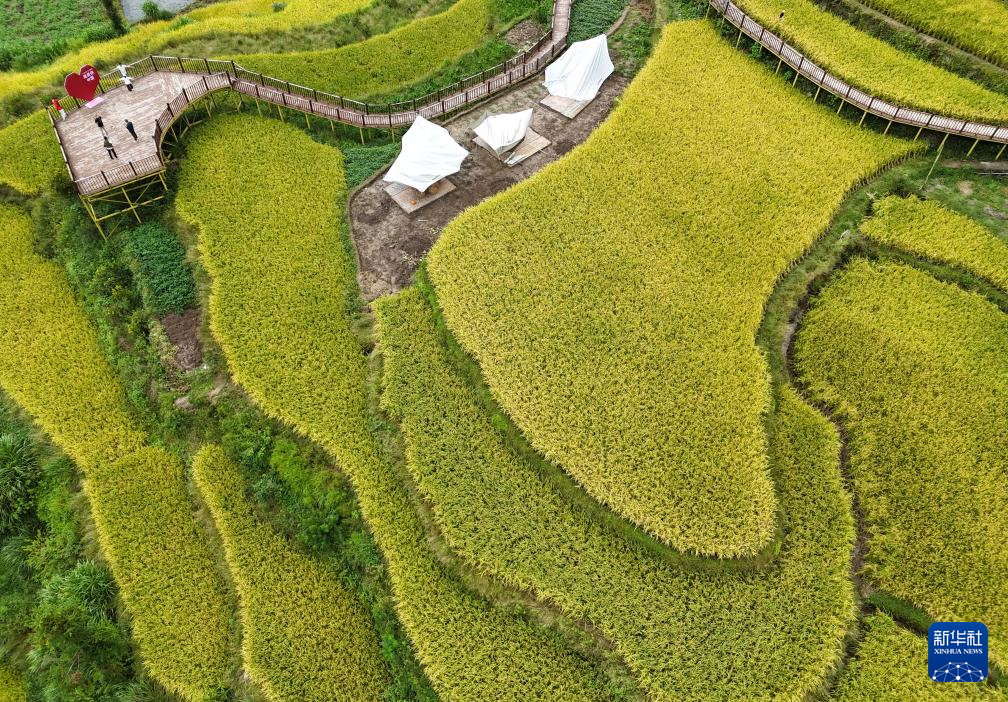 10月6日,游客在浙江省乐清市中雁村的梯田间赏景(无人机照片)。