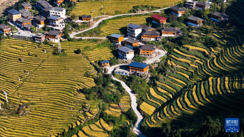 10月6日拍摄的广西桂林市龙胜各族自治县泗水乡周家村的梯田和民居(无人机照片)。