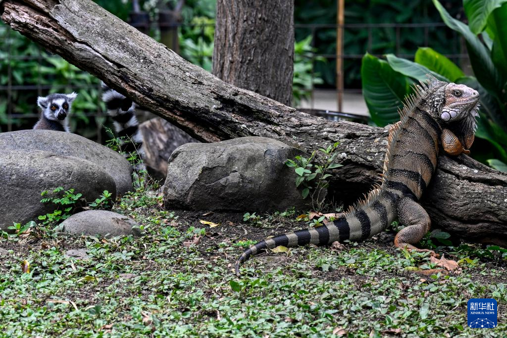 这是10月24日在哥伦比亚卡利动物园拍摄的环尾狐猴(左)和鬣蜥。