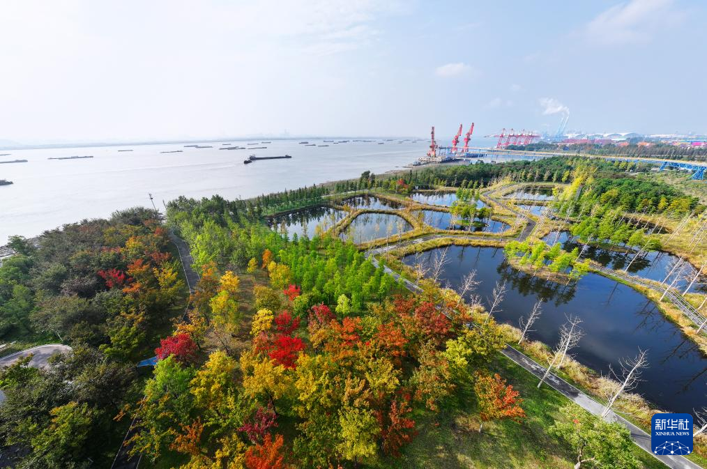 这是10月28日拍摄的位于长江扬州段一处“口袋公园”秋景(无人机照片)。
