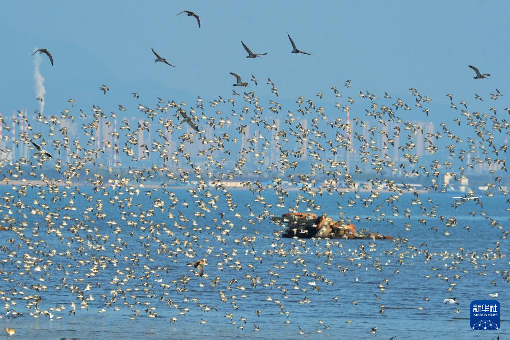 10月29日,成群候鸟在山东省青岛市城阳区红岛街道滨海湿地飞翔。