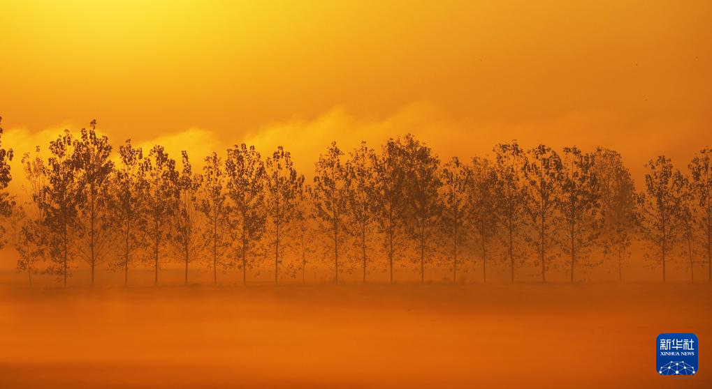 10月29日,在山东省临沂市郯城县郯城街道,树木沐浴在金色晨光中。