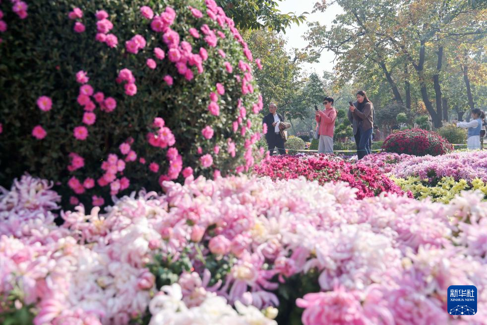 10月29日,市民在山东省临沂市国际雕塑公园赏菊花。