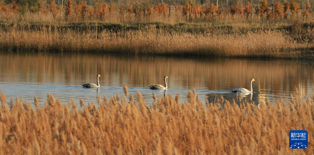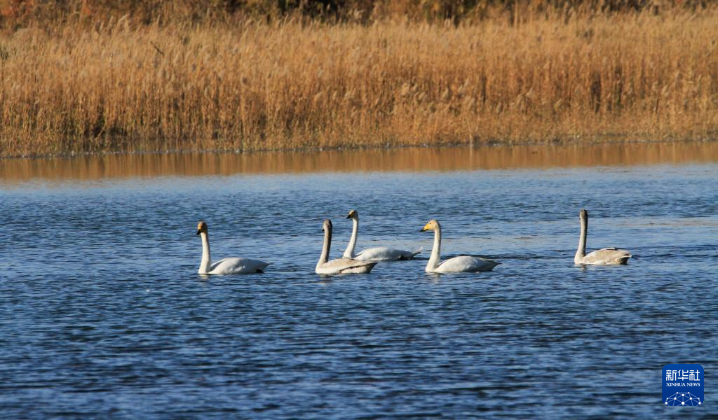 10月28日,几只天鹅在甘肃张掖国家湿地公园湖水中栖息觅食。