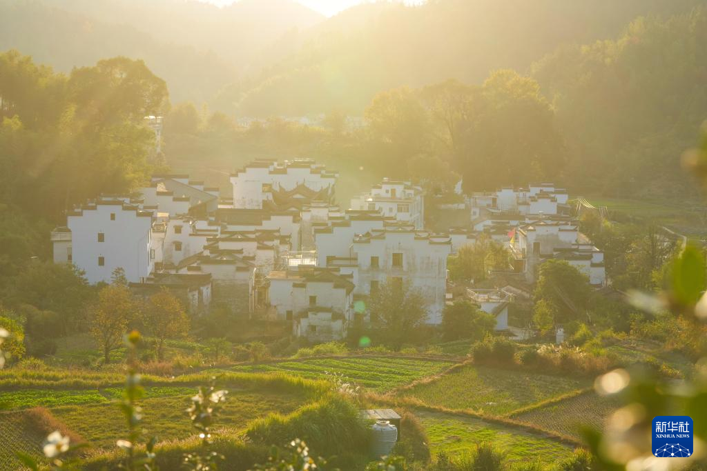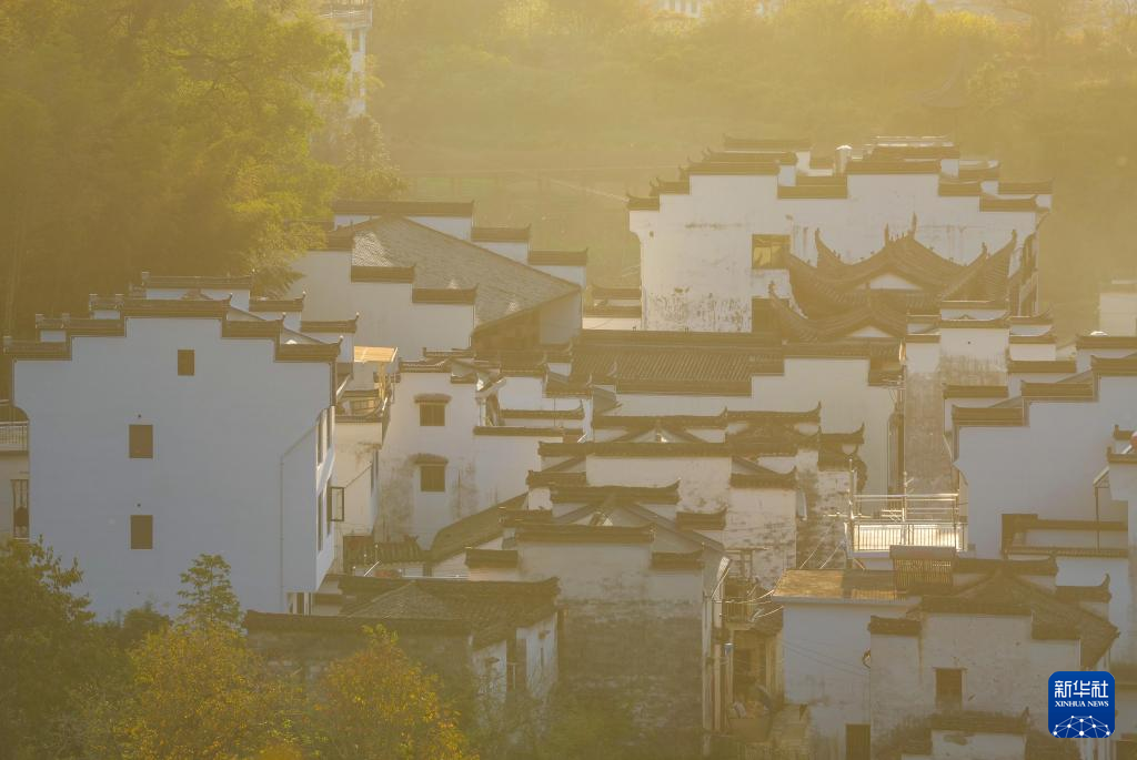 11月9日,婺源县庐坑村的徽派民居在夕阳照射下,粉墙黛瓦仿佛披上了一层金色的外衣。